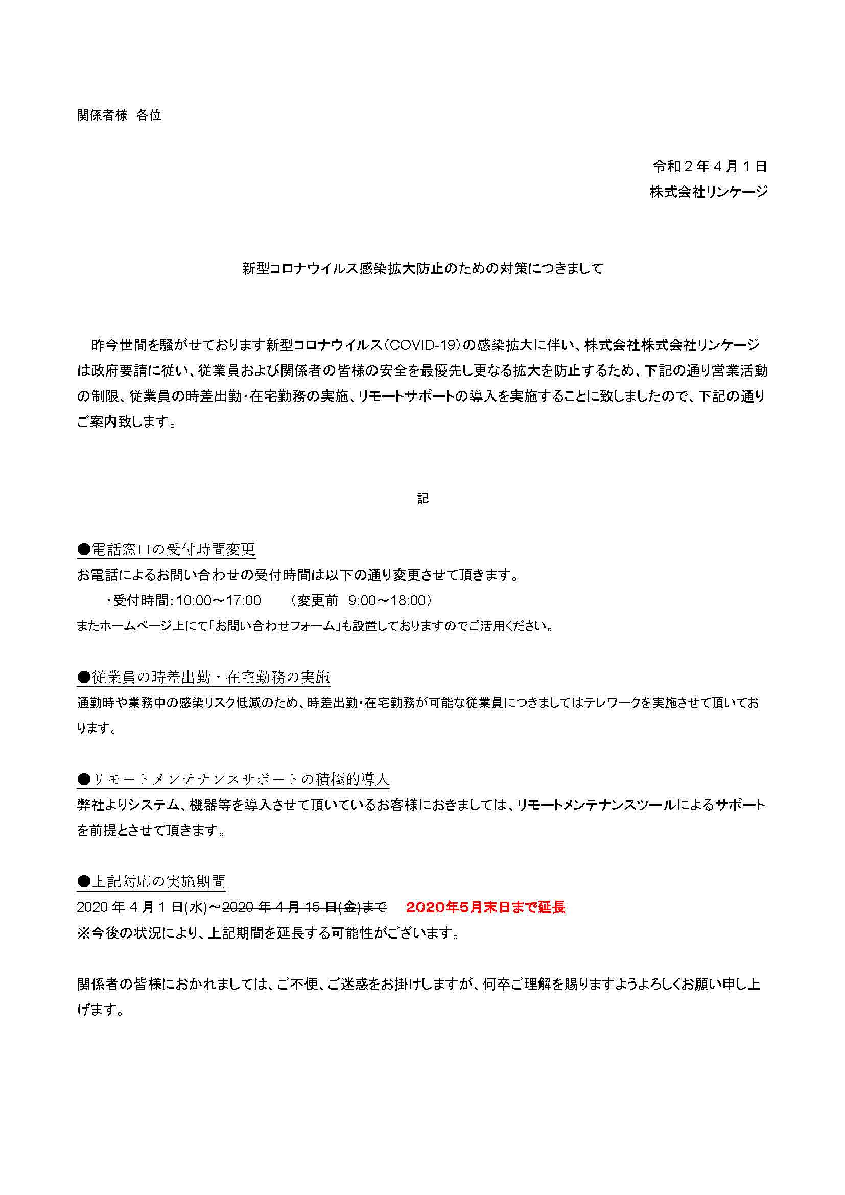 平素より格別のご高配を賜り厚くお礼申し上げます。株式会社リンケージは新型コロナウイルス対策として、令和2年4月1日より下記の通り対策を実施しております。