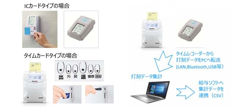 弊社としてはICカード型をお勧めしますが、従来通りのタイムカード型のまま打刻時間をデータ化することも可能です。
