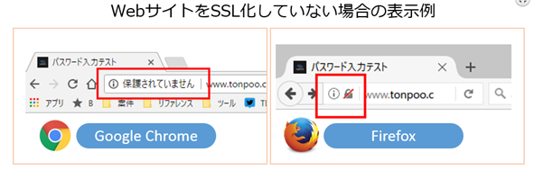 「Google Chrome」や「Mozilla Firefox」などのブラウザにて、セキュリティ対策をしていないサイトは危険だという警告を告知するようになりました。さらに今後SSL対応を施していないホームページに対するセキュリティ警告がより顕著になっていくことが予想され、SSL対応は自社サイトが安全であるということの証明書の役割を果たすようになってくるようになります。